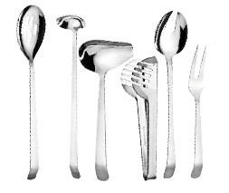 Formschönes schlichtes Vorlagenbesteck aus Edelstahl. Mit mattpolierten griffen und gebogenen Stielenden. so wird das Abrutschen in die Speisen verhindert. Spülmaschienendfest.
